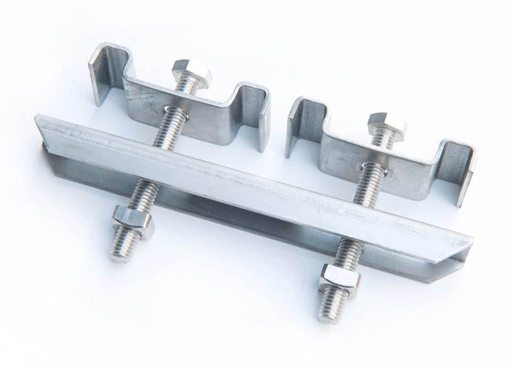 Verbindungsklemme komplett, Edelstahl 316, für Maschen der Größe 50 x 50 mm. Die Verbindungsklemme verbindet zwei Gitterroste an der Stelle miteinander, wo eine Gitterrostteilung nicht unterstützt wird.
