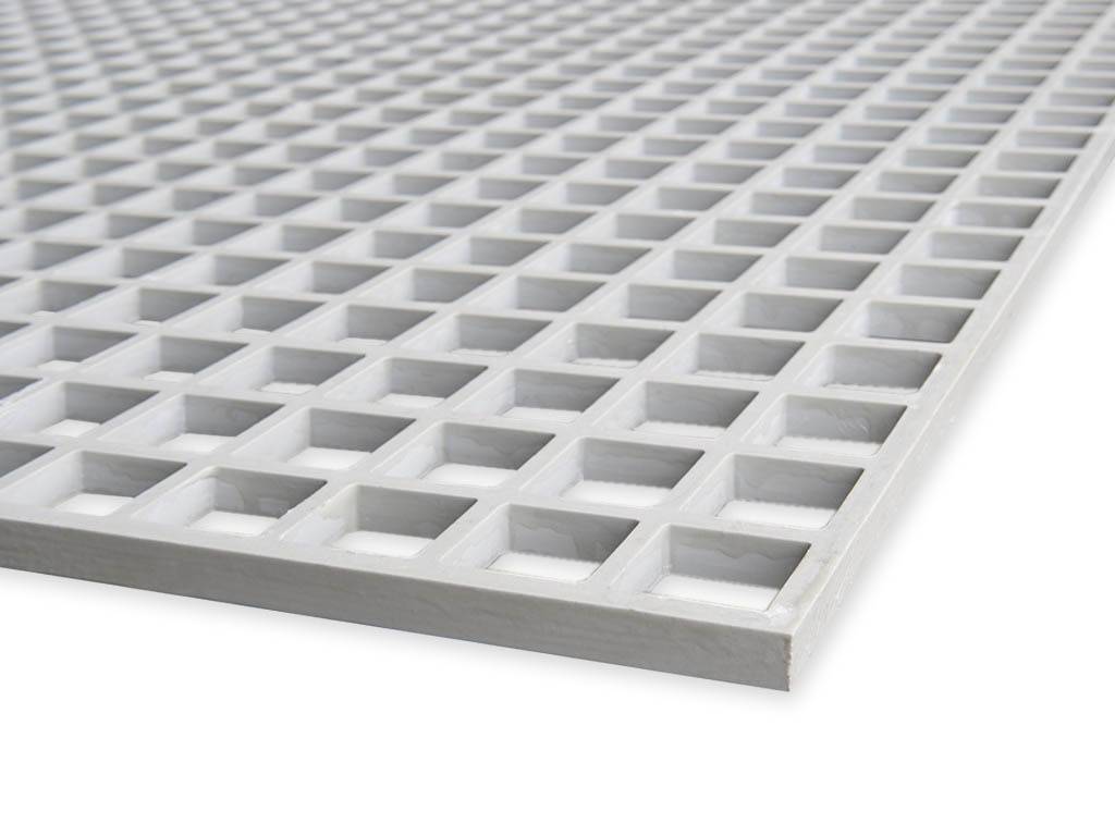 Dieses GFK-Gitter aus Isophthal-Polyester eignet sich für verschiedene Anwendungen. Dieser Typ hat eine Maschenweite von 38 × 38 mm und ist mit einer rutschfesten Konkave Deckschicht versehen.