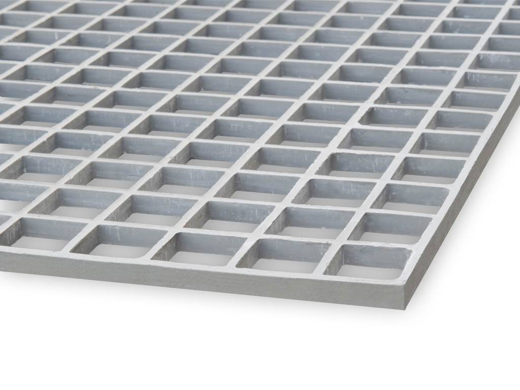 Dieses GFK-Gitter aus Isophthal-Polyester eignet sich für verschiedene Anwendungen. Dieser Typ hat eine Maschenweite von 50 × 50 mm und ist mit einer rutschfesten Konkave Deckschicht versehen.