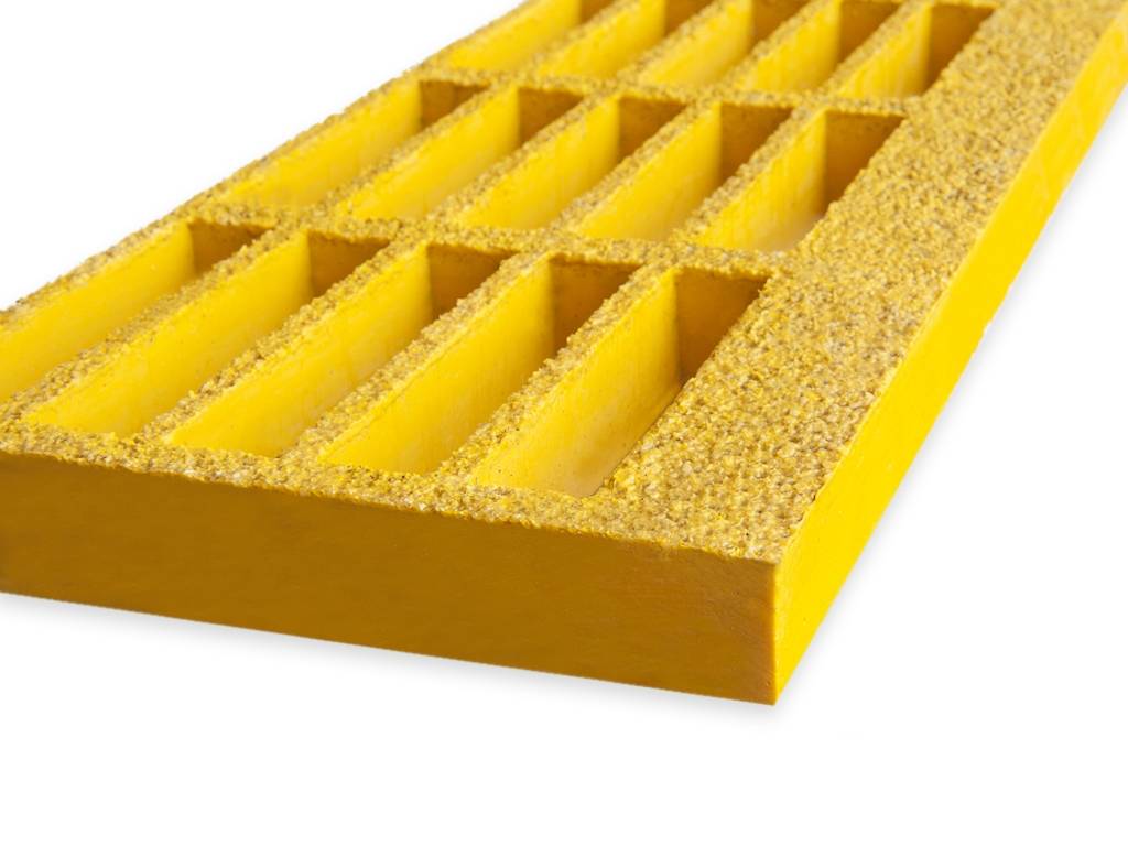 Eine Standard-Kunststofftreppenstufe mit rechteckigen Maschen, verstärkter Vorderkante und rutschfester Quarzsandoberfläche. Die Stufe ist nach Maß zu bestellen. Die Tiefe beträgt standardmäßig 238 mm. Die Breite dieser Treppenstufe kann bei bis zu 610 mm liegen. Die Maschen sind 152 x 38 mm groß.