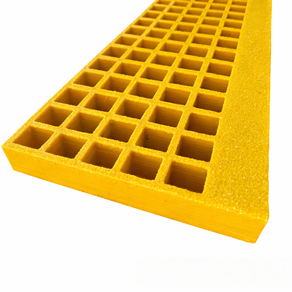 Eine Standard-Kunststofftreppenstufe mit rechteckigen Maschen, verstärkter Vorderkante und rutschfester Quarzsandoberfläche. Die Stufe ist nach Maß zu bestellen. Die Tiefe beträgt standardmäßig 238 mm. Die Breite dieser Treppenstufe kann bei bis zu 610 mm liegen. Die Maschen sind 152 x 38 mm groß.