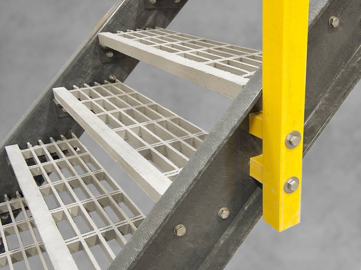 Eine Standard-Kunststofftreppenstufe mit rechteckigen Maschen, verstärkter Vorderkante und rutschfester Quarzsandoberfläche. Die Stufe ist nach Maß zu bestellen. Die Tiefe beträgt standardmäßig 238 mm. Die Breite dieser Treppenstufe liegt zwischen 915 und 1066 mm. Die Maschen sind 152 x 38 mm groß.